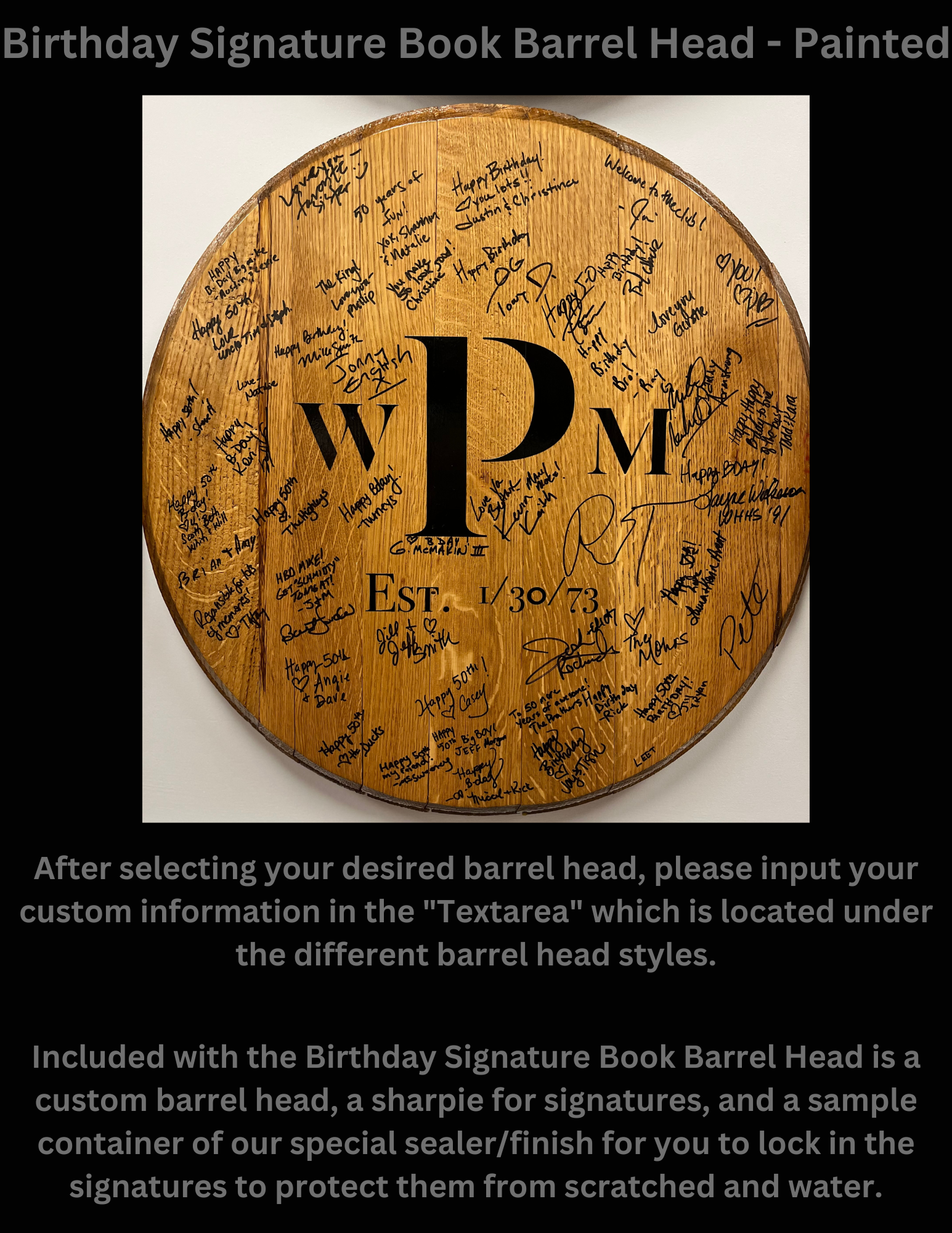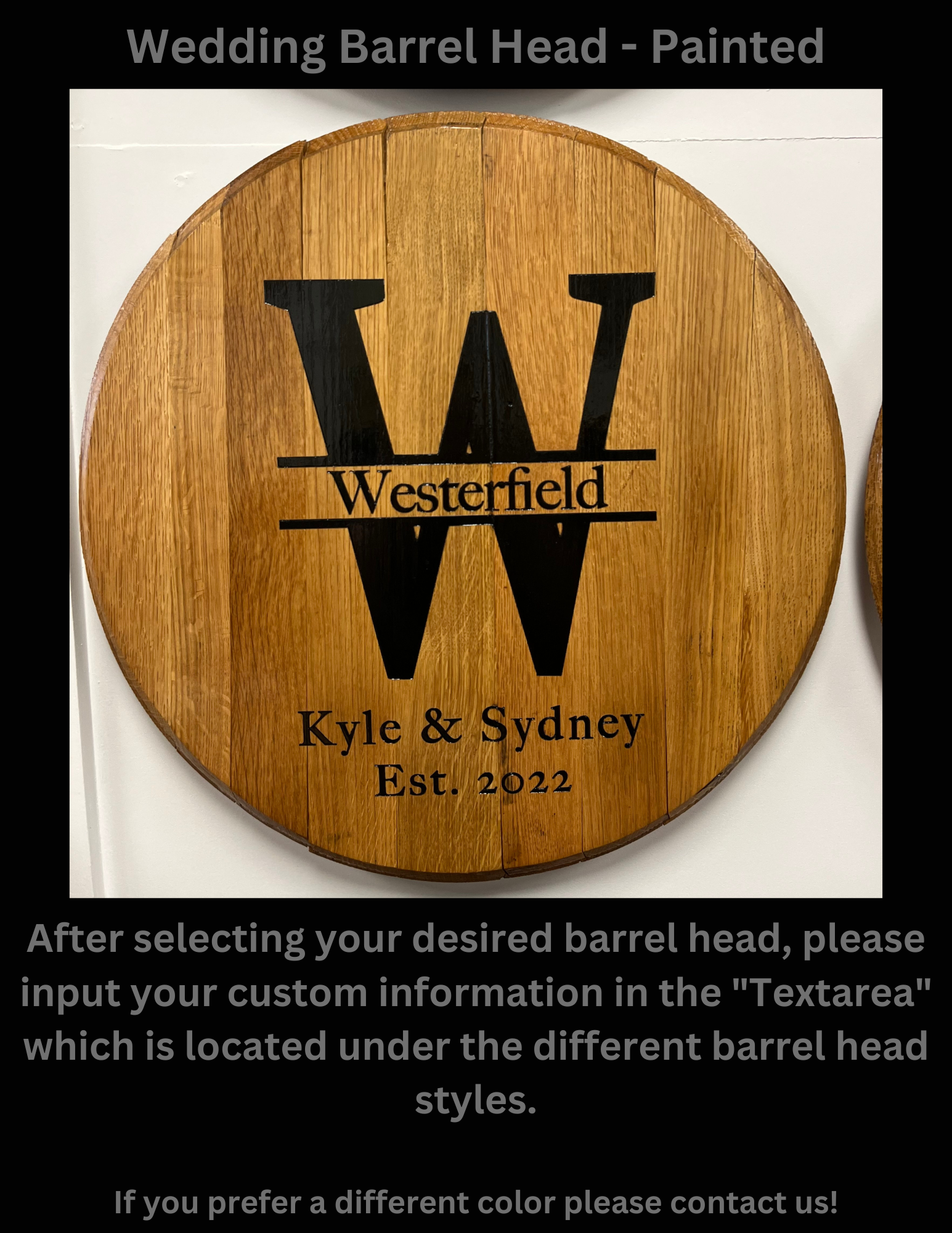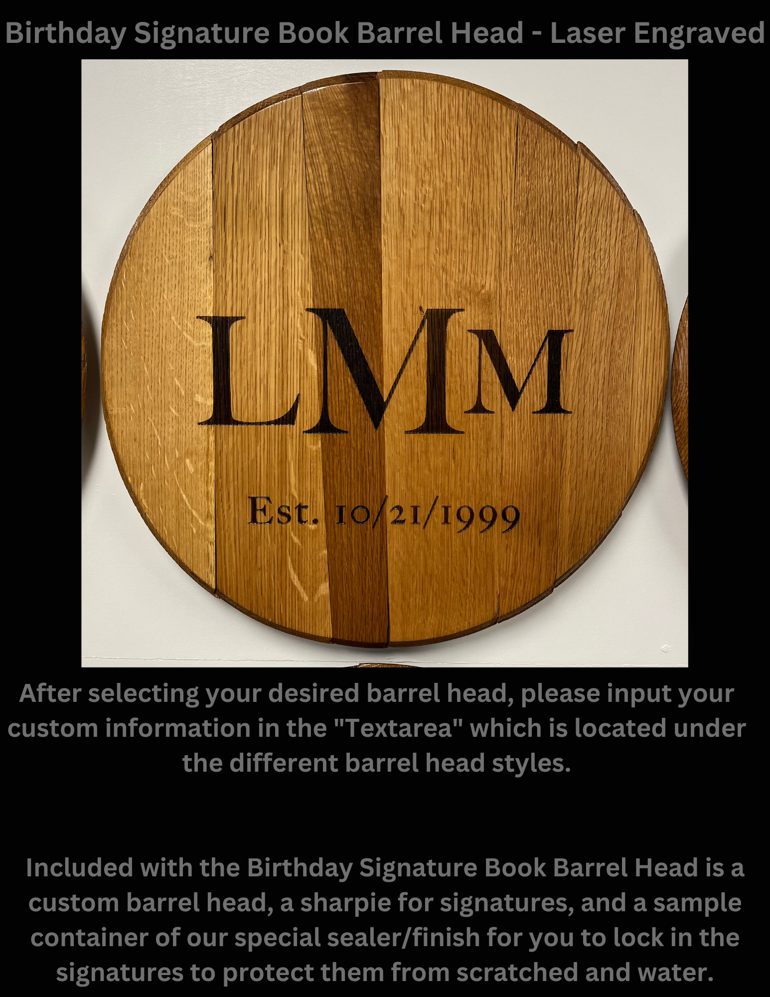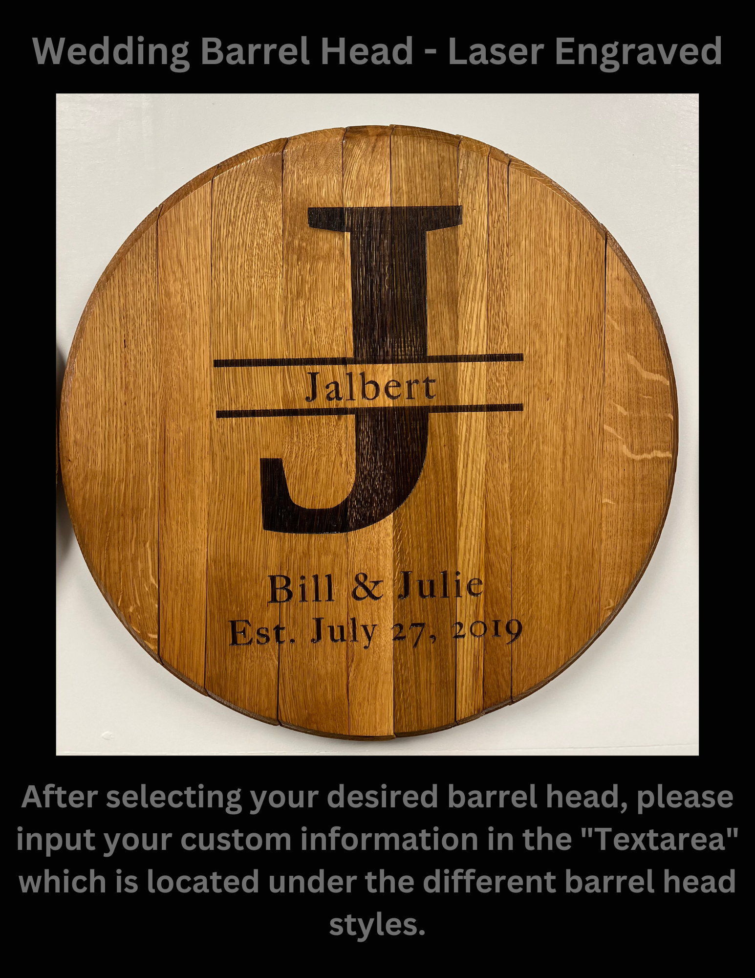 Have a loved one getting married? We have you covered. Our barrel heads are dried and humidity checked to ensure your product looks the same as you bought it for years to come.